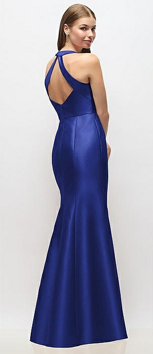 Criss Cross Halter Open-Back Stretch Satin Mermaid Dress in cobalt blue