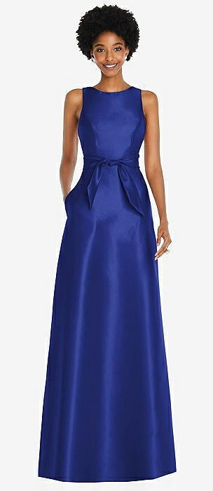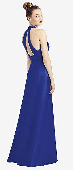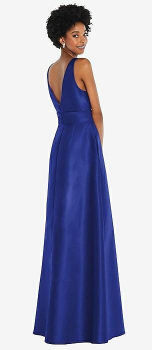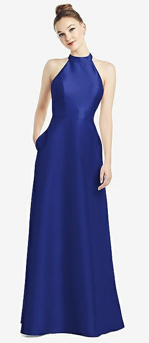 Open Neckline Cutout Satin Twill A-Line Gown with Pockets in cobalt blue