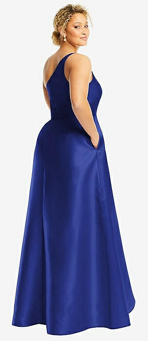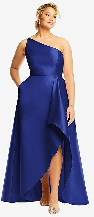 One-Shoulder Satin Gown with Draped Front Slit and Pockets in cobalt blue