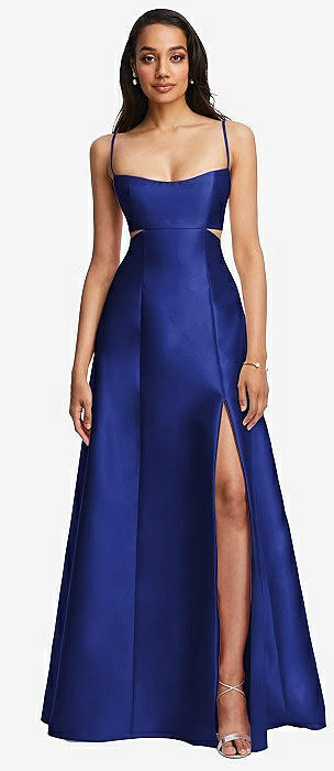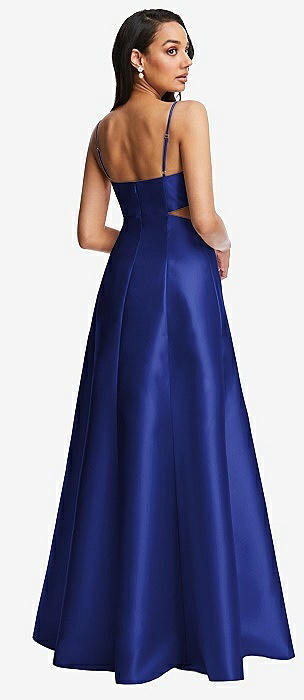 Open Neckline Cutout Satin Twill A-Line Gown with Pockets in cobalt blue