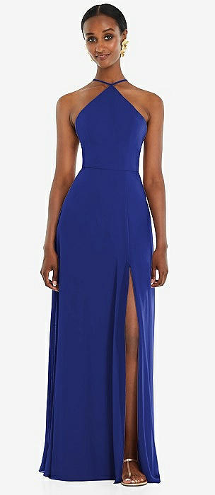 Stand Collar Halter Maxi Dress with Criss Cross Open-Back in cobalt blue
