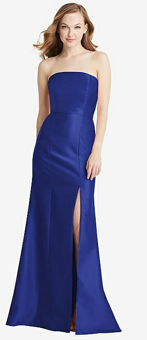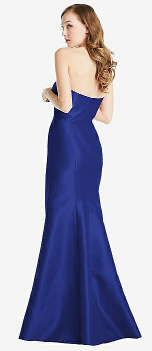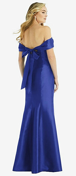 Off-the-Shoulder Bow-Back Satin Trumpet Gown in cobalt blue
