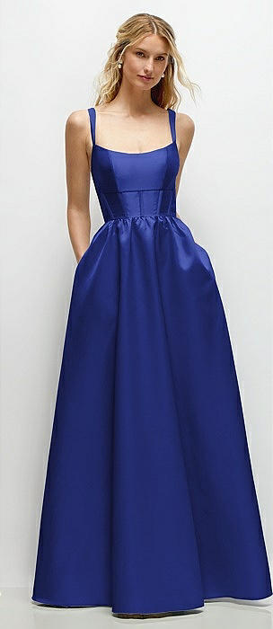 Scoop Neck Inset Corset Satin Maxi Dress with Pockets in cobalt blue