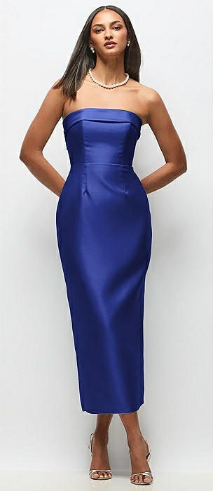 Strapless Cuff Satin Midi Dress with Column Skirt & Back Bow in cobalt blue