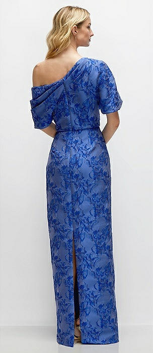 Asymmetrical Off-the-Shoulder Cobalt Floral Metallic Jacquard Maxi Dress in cobalt jacquard