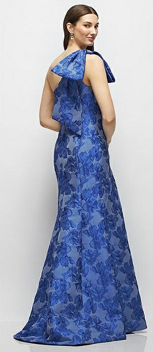 Bow One-Shoulder Cobalt Floral Metallic Jacquard Trumpet Maxi Dress in cobalt jacquard
