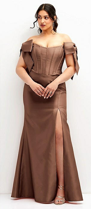 Off-the-Shoulder Bow Satin Corset Dress with Fit and Flare Skirt in cognac