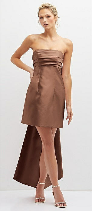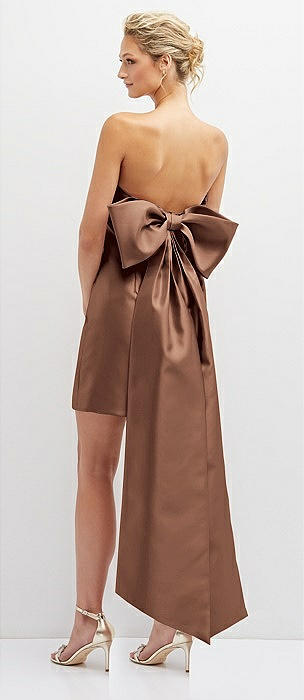 Strapless Satin Column Mini Dress with Oversized Bow in cognac