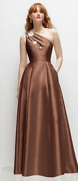 One-Shoulder Full A-Line Satin Gown with Handworked Floral Appliqué in cognac