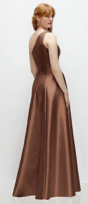 One-Shoulder Cat-Eye Neckline Fit and Flare Satin Maxi Dress in cognac