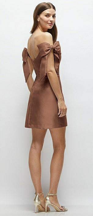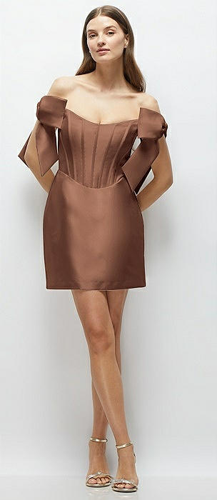 Satin Off-the-Shoulder Bow Corset Fit and Flare Mini Dress in cognac