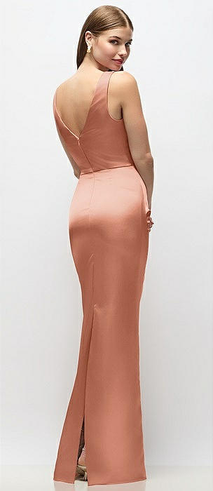 Sleeveless Draped Wrap Bodice Stretch Satin Column Maxi Dress in copper penny