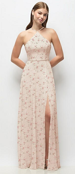 High-Neck Halter Floral Chiffon Maxi Dress with Adjustable Spaghetti Straps in coquette floral print