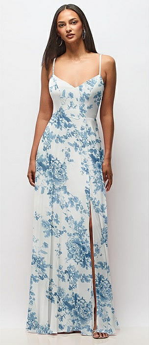 Tie-Shoulder Chiffon Maxi Dress with Front Slit in cottage rose dusk blue