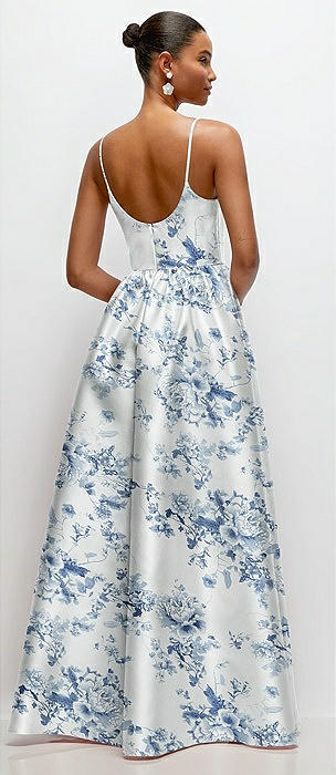 Whether you're looking for all-out romance or something more on the glamorous side, our Cottage Rose Larkspur bridesmaid dresses are the ultimate pick. Its oversized dusty blue blooms and foliage on a white glossy satin twill fabric are reminiscent of a delicate vintage china pattern. Elegant, glamorous and fabulously feminine, these vintage-inspired dusty blue floral gowns are perfect for spring or summer and come in a range of captivating styles.