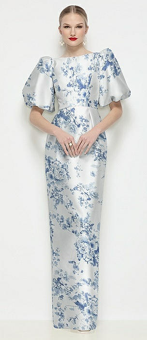 Bateau Neck Floral Satin Column Maxi Dress with Puff Sleeves in cottage rose larkspur
