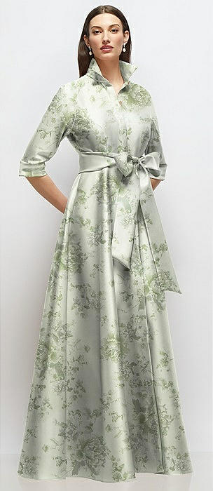 3/4 Sleeve Floral Satin Shirt Dress Gown with Sash and Jeweled Buttons in sage cottage rose