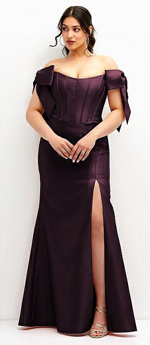 Off-the-Shoulder Bow Satin Corset Dress with Fit and Flare Skirt in deep plum