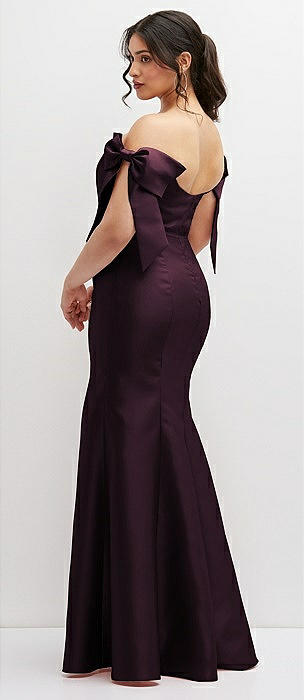 Deep V-back Satin Trumpet Dress with Cascading Bow at One Shoulder in deep plum