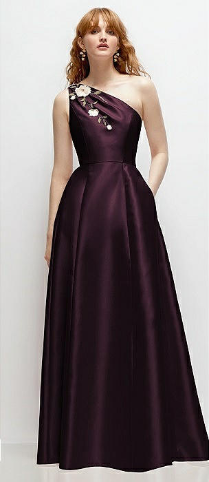 One-Shoulder Full A-Line Satin Gown with Handworked Floral Appliqué in deep plum