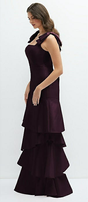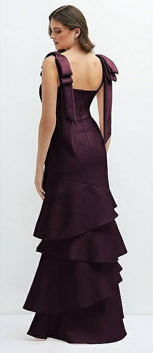 Bow-Shoulder Satin Maxi Dress with Asymmetrical Tiered Skirt in deep plum