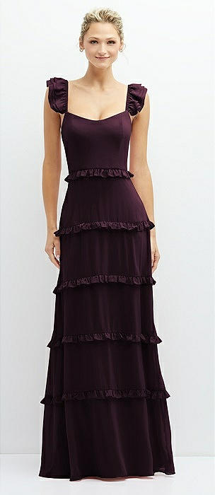 Tiered Chiffon Maxi A-line Dress with Convertible Ruffle Straps in deep plum
