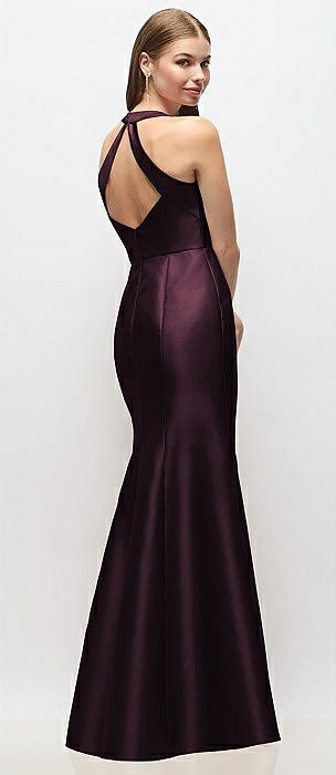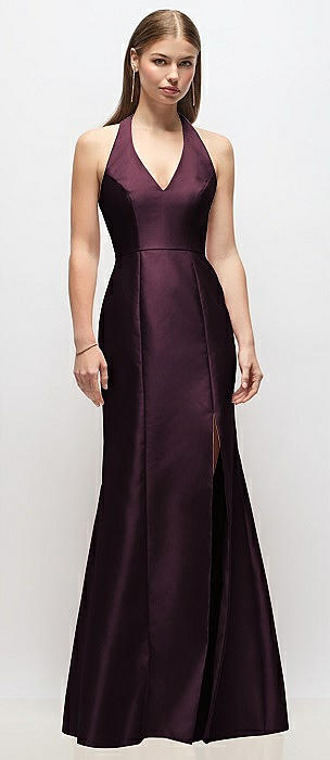 V-Neck Halter Satin Trumpet Gown in deep plum