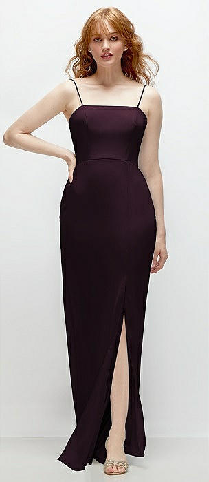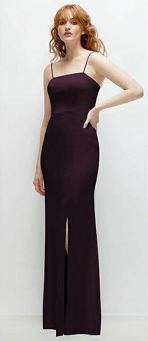 Strapless Satin Gown with Draped Front Slit and Pockets in deep plum