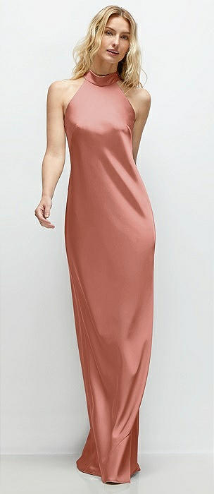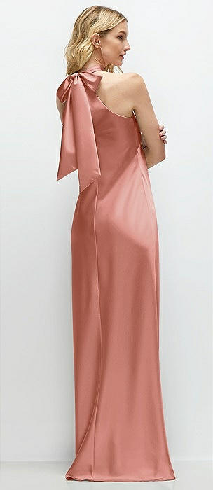 Pleated Halter Bias Satin Maxi Dress with Self-Tie Bow Back in desert rose