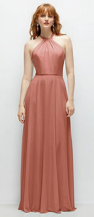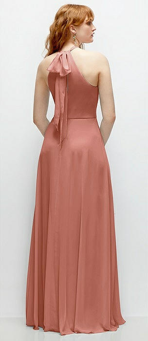 Shirred Halter Chiffon Maxi Dress with Back Sash-Tie Closure in desert rose