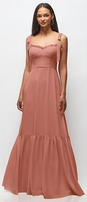 Tie-Shoulder Bustier Bodice Ruffle-Hem Maxi Dress in desert rose