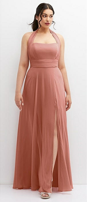 Shirred Skirt Jewel Neck Halter Dress with Front Slit in desert rose