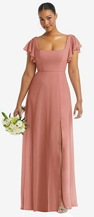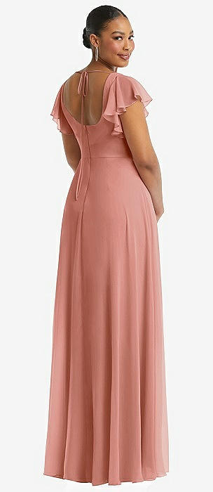 Flutter Sleeve Scoop Open-Back Chiffon Maxi Dress