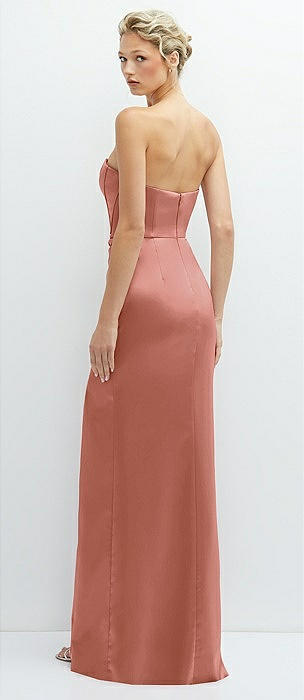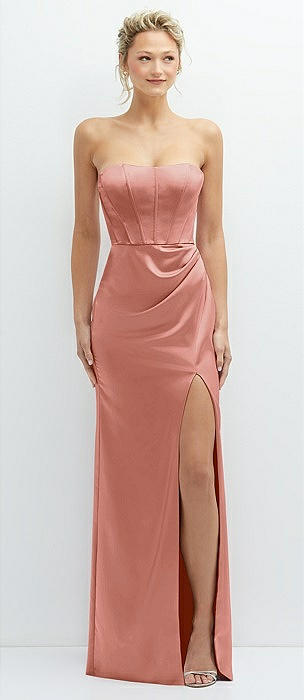 Strapless Topstitched Corset Satin Maxi Dress with Draped Column Skirt in desert rose