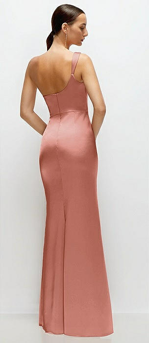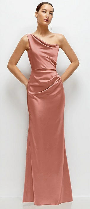 One-Shoulder Cat-Eye Neckline Fit and Flare Satin Maxi Dress in desert rose
