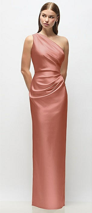 One-Shoulder Draped Bodice Stretch Satin Column Maxi Dress in desert rose