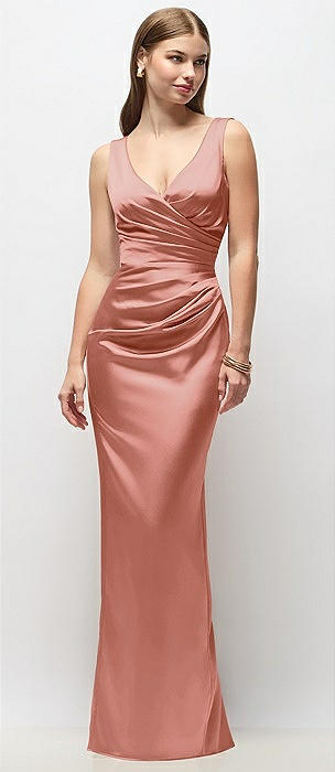Sleeveless Draped Wrap Bodice Stretch Satin Column Maxi Dress in desert rose