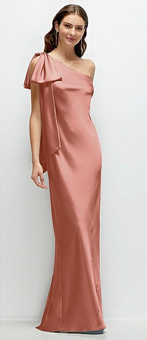 One-Shoulder Bias-Cut Satin Maxi Dress with Cascading Shoulder Bow in desert rose