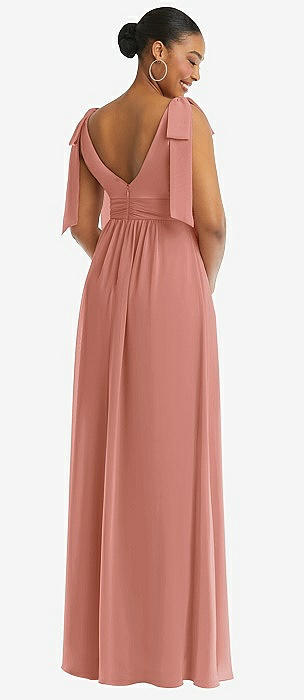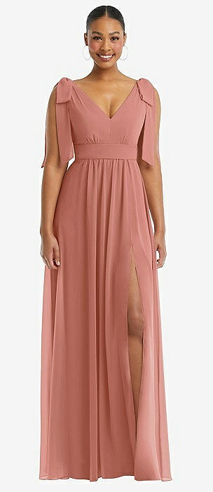 Plunge Neckline Bow Shoulder Empire Waist Chiffon Maxi Dress in desert rose