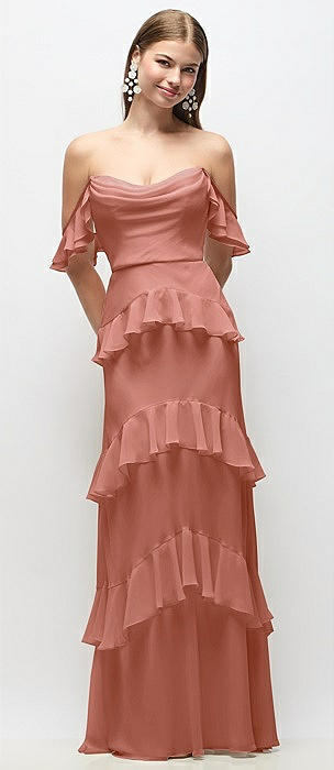 Off-the-Shoulder Cowl Chiffon Tiered Ruffle Maxi Dress with Convertible Ruffle Straps in desert rose