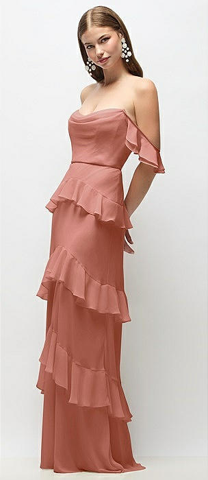Off-the-Shoulder Cowl Chiffon Tiered Ruffle Maxi Dress with Convertible Ruffle Straps
