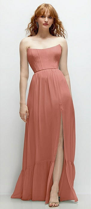 Strapless Cat-Eye Corset Maxi Dress with Ruffle Hem A-Line Skirt in desert rose