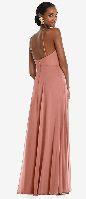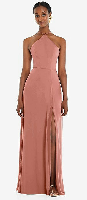 High Halter Tie-Strap Open-Back Satin Maxi Dress in desert rose