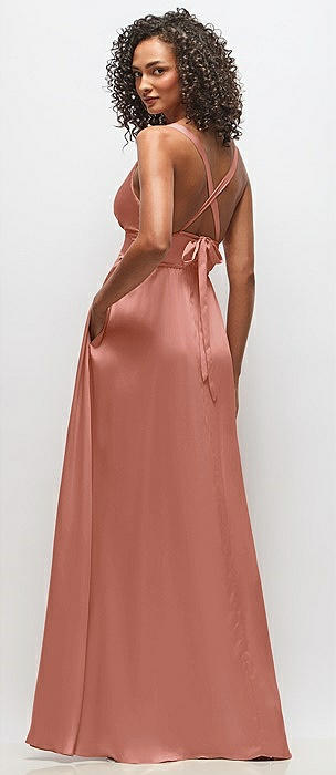 Soft Cowl Neck Ruched Side Satin Bias Maxi Dress with Shoulder Bows