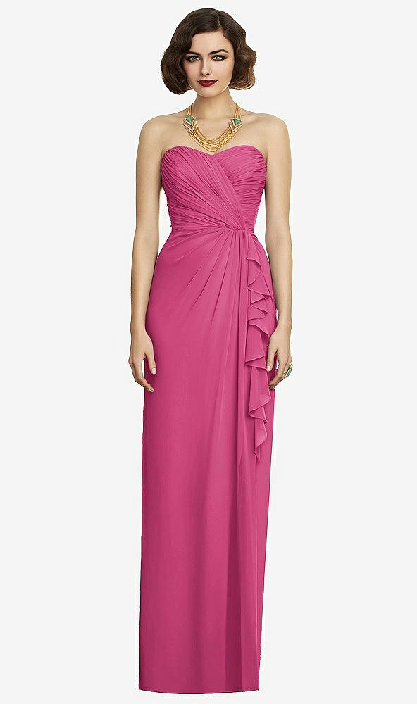 Attention to detail yields an exquisite choice in this strapless full-length bridesmaid dress. Lux chiffon provides a soft and flowing fabric that drapes beautifully over its bodice and adds a bias ruffle down the front side. A slit front skirt offers an alluring element.