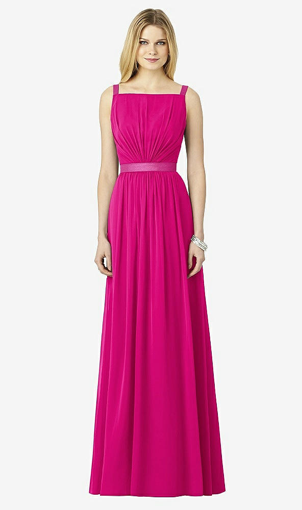 Full length bridesmaid dress in lux chiffon fabric has high neck and sunburst shirring at bodice. Low back. Straps and inset waistband are lux chiffon over metallic silver lurex. Shirred skirt.