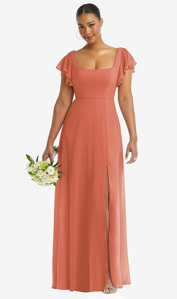 Flutter Sleeve Scoop Open-Back Chiffon Maxi Dress in Terracotta Copper