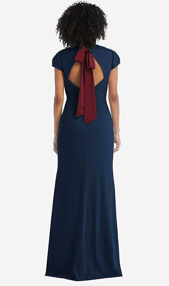 Back View - Midnight Navy & Cabernet Puff Cap Sleeve Cutout Tie-Back Trumpet Gown