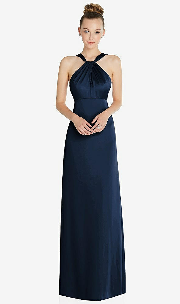 Draped Twist Halter Low-Back Satin Empire Dress in Midnight Navy