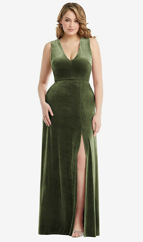 Deep V-Neck Sleeveless Velvet Maxi Dress with Pockets in Olive Green